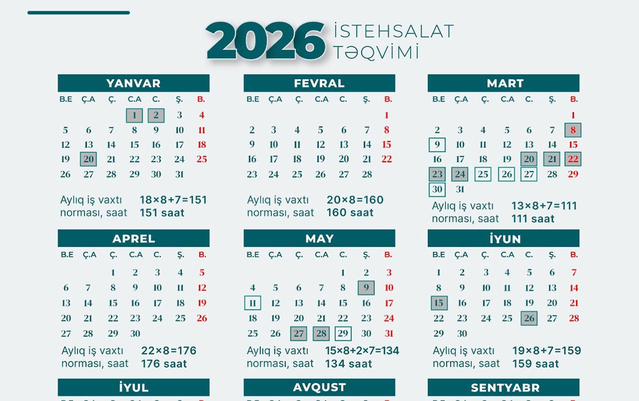 2026-cı il üçün iş vaxtı normasında qeyd edilir ki, Əmək Məcəlləsinə və Nazirlər Kabinetinin “2026-cı il üçün Novruz, Ramazan və Qurban bayramları günlərinin müəyyən edilməsi haqqında” 2025-ci il 2 dekabr tarixli 362 nömrəli Qərarına əsasən 2026-cı ildə aşağıdakı günlər iş günü hesab edilmir: